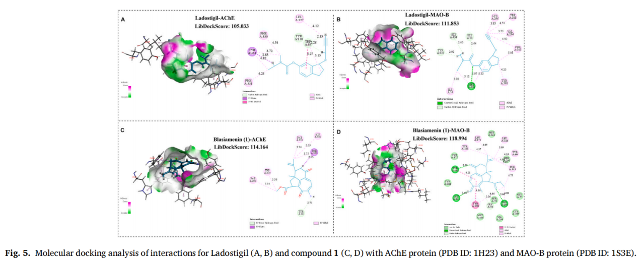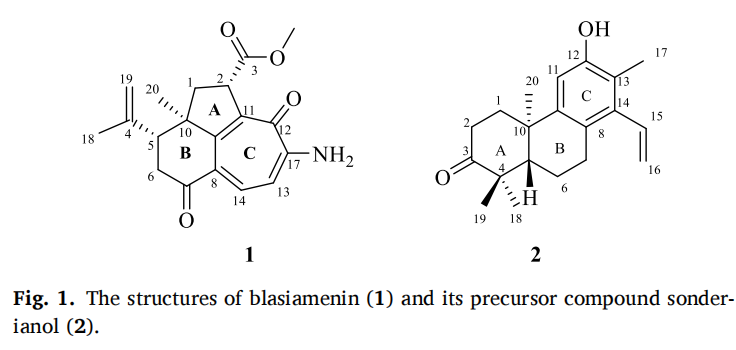 チャンは 、これまで記載されていなかったトリシクロジノール-ジテルペノイドおよびその前駆体成分ソンデリアノール(2)をB. siamensisから分離しました。その構造はHRESIMS、分光技術、特にECD計算やNMR計算(DP4+解析を含む)によって確立されました。化合物1の分子ドッキング結果は、AChEおよびMAO-B阻害の可能性を示しました。特定の構造を持つ代謝物の種類は、植物が高温・高湿度・強い光などの逆のストレスに対処する際の防御反応である可能性があります。自然選択と生物システムの共進化の影響により、化学的に合成された薬物と比べて、これらの天然産物は特別な